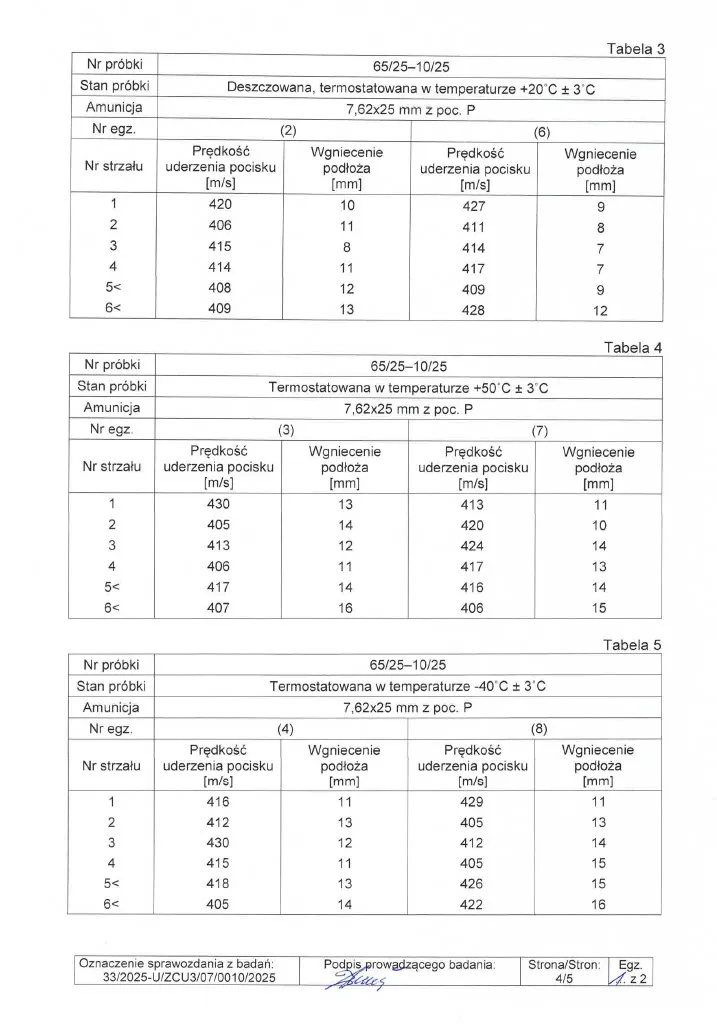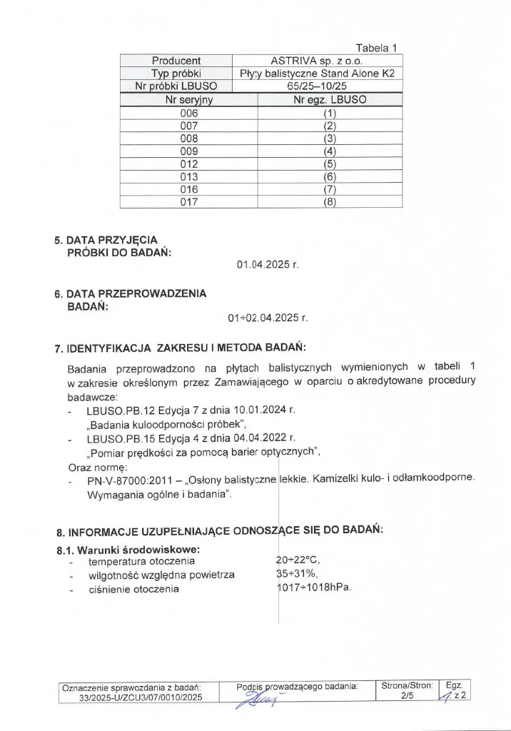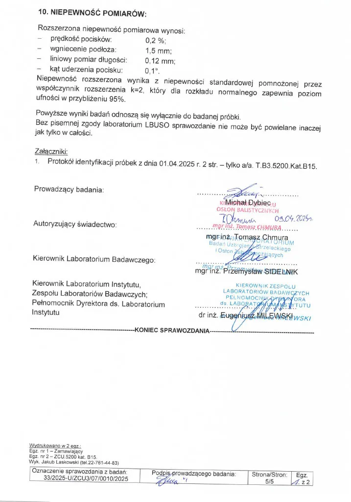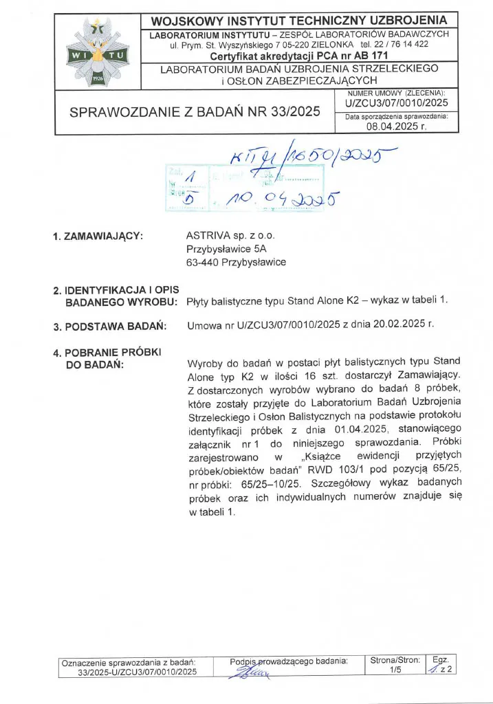 Sprawozdanie z badań nr 33/2025 zgodnie z normą PN-V-87000-2011, wykonane w akredytowanym Laboratorium Badań Uzbrojenia Strzeleckiego i Osłon Zabezpieczających Wojskowego Instytutu Technicznego Uzbrojenia (WITU), certyfikat akredytacji PCA nr AB 171.