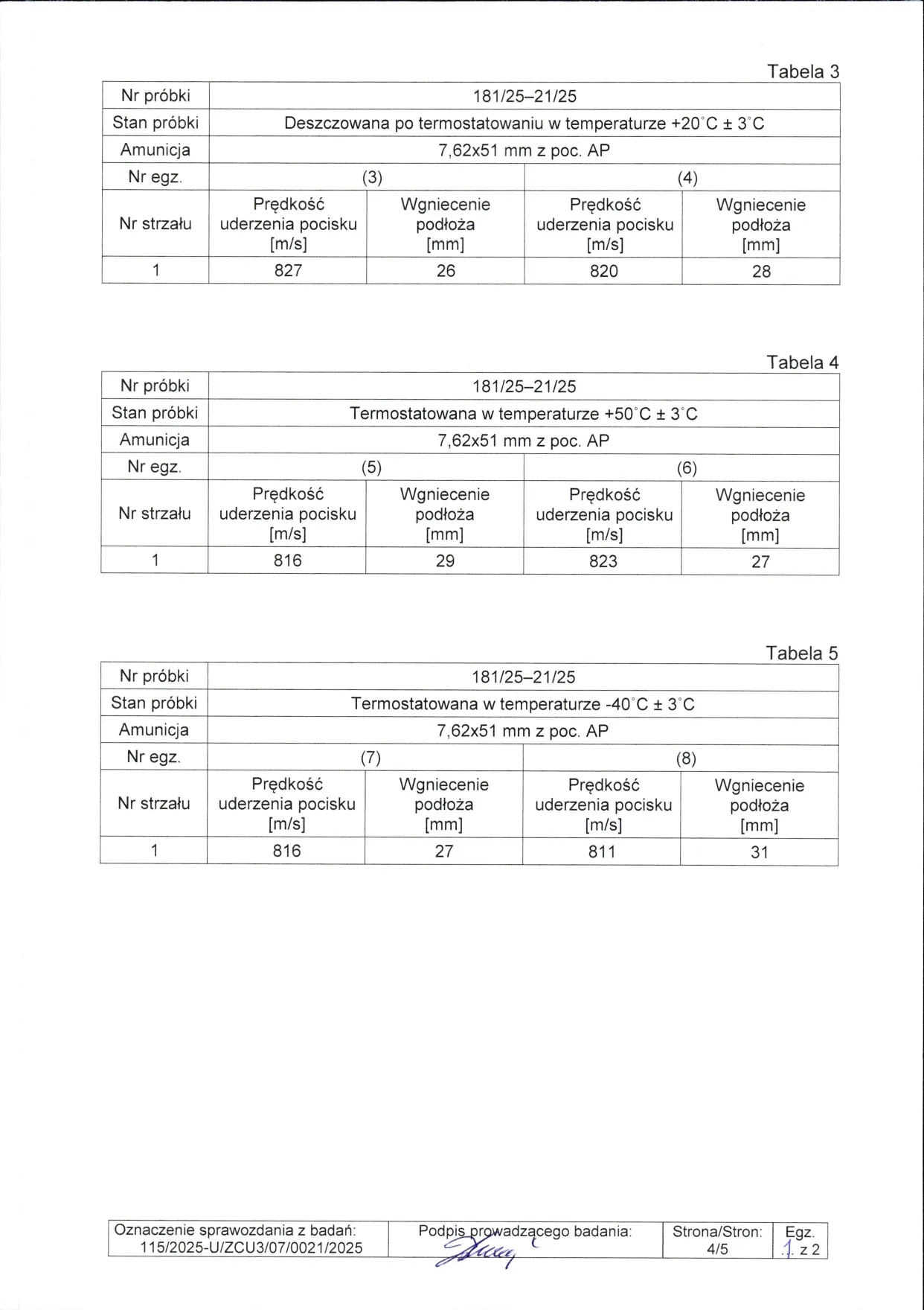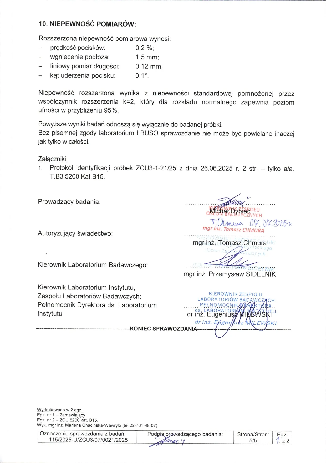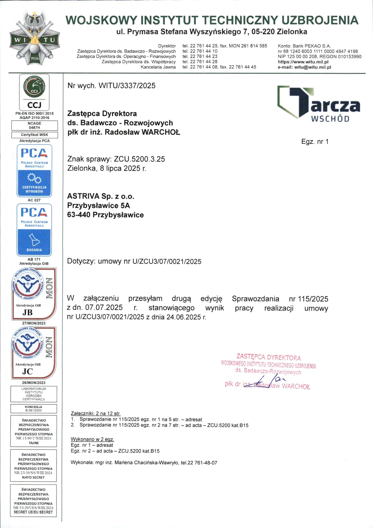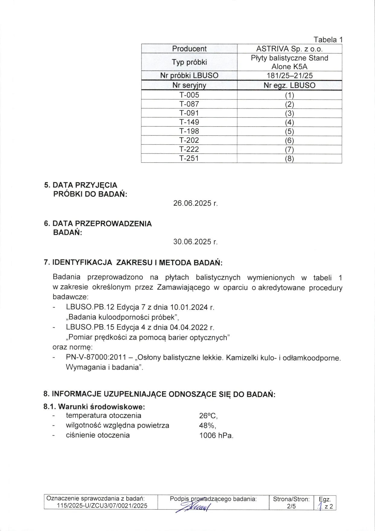 Sprawozdanie z badań nr 115/2025 zgodnie z normą PN-V-87000-2011, wykonane w akredytowanym Laboratorium Badań Uzbrojenia Strzeleckiego i Osłon Zabezpieczających Wojskowego Instytutu Technicznego Uzbrojenia (WITU), certyfikat akredytacji PCA nr AB 171.
