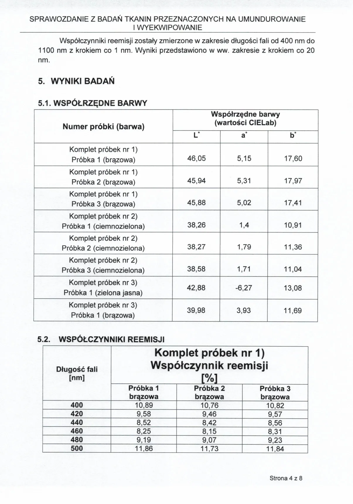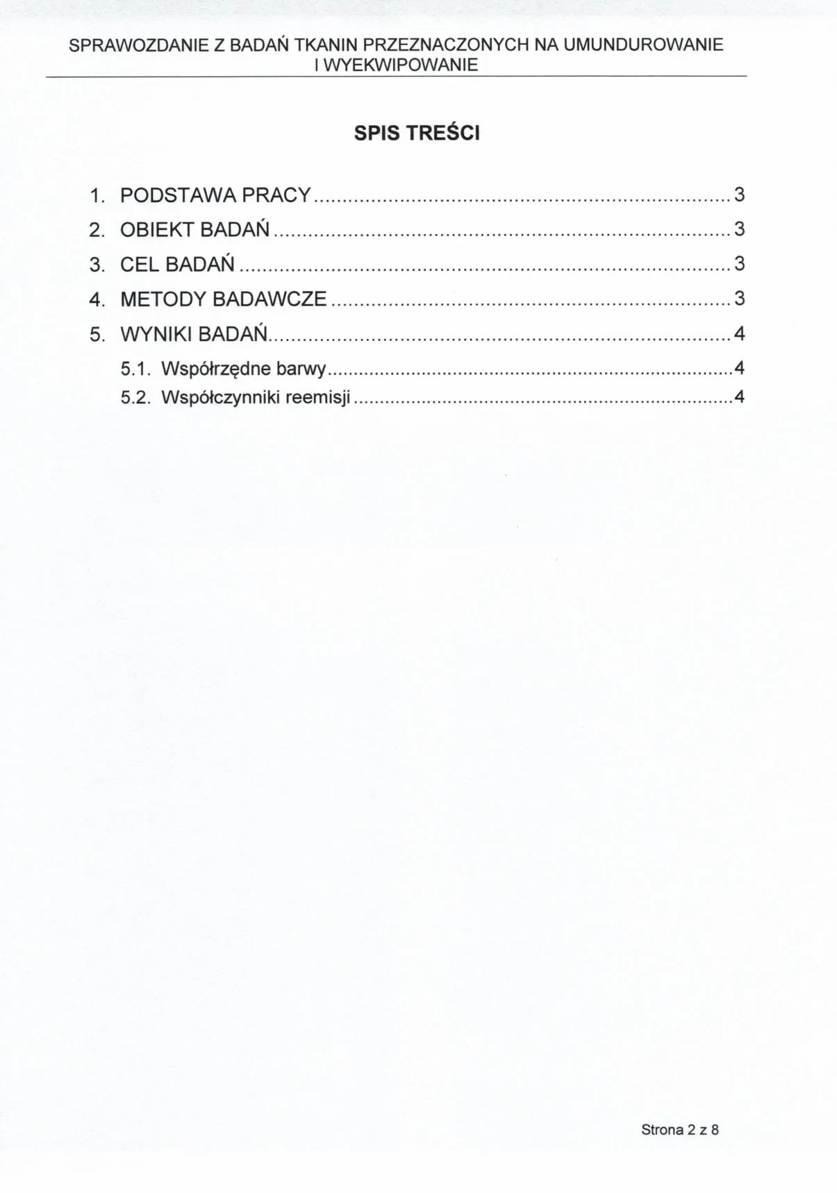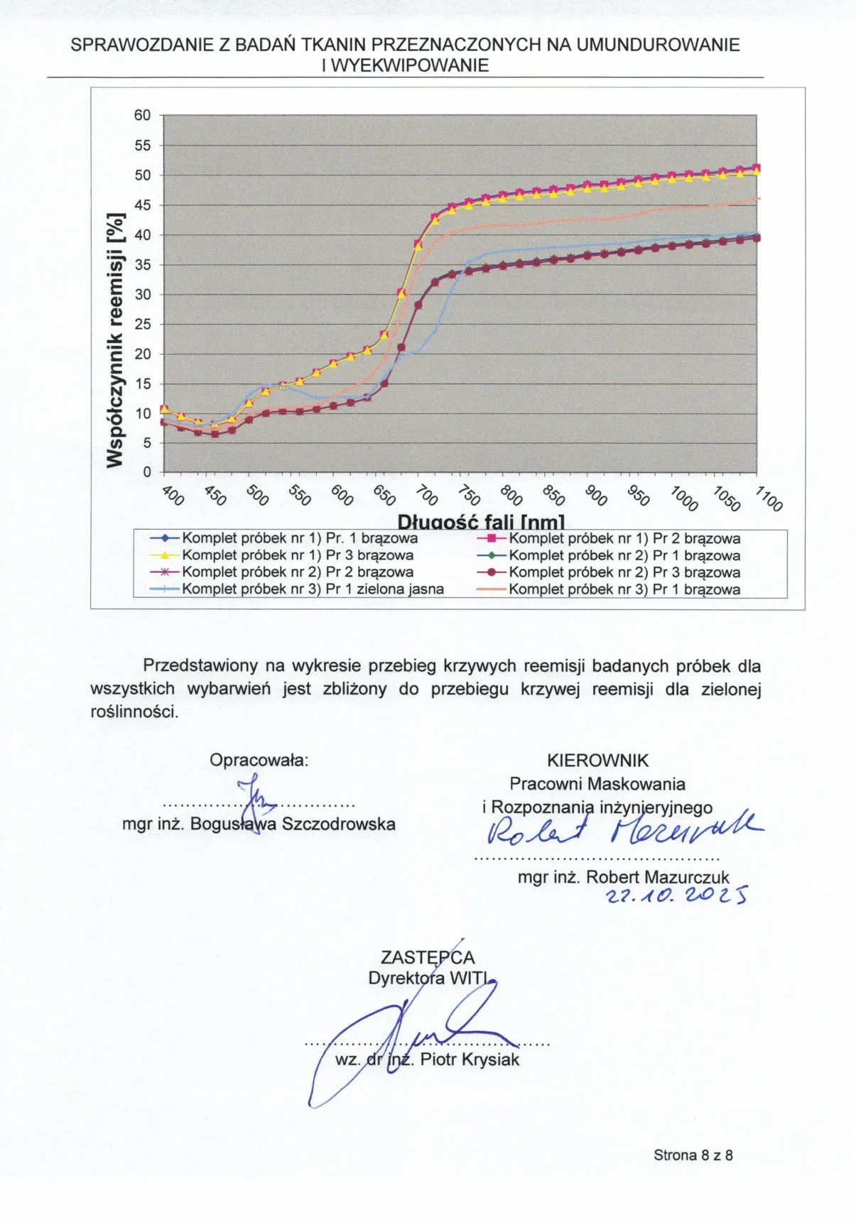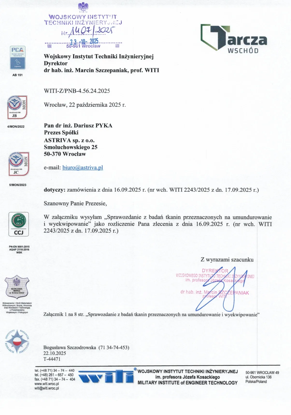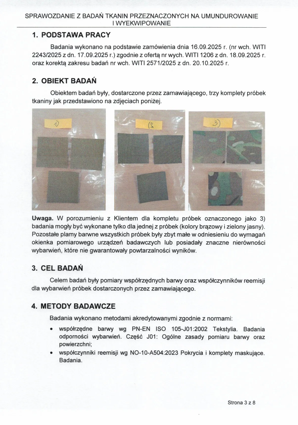 Sprawozdanie z badań nr 2243/2025 zgodnie z normą PN-EN ISO 105-J01:2002, NO-10-A504:2023, wykonane w akredytowanym Wojskowym Instytucie Techniki Inżynieryjnej (WITI), certyfikat akredytacji PCA nr AB 151.